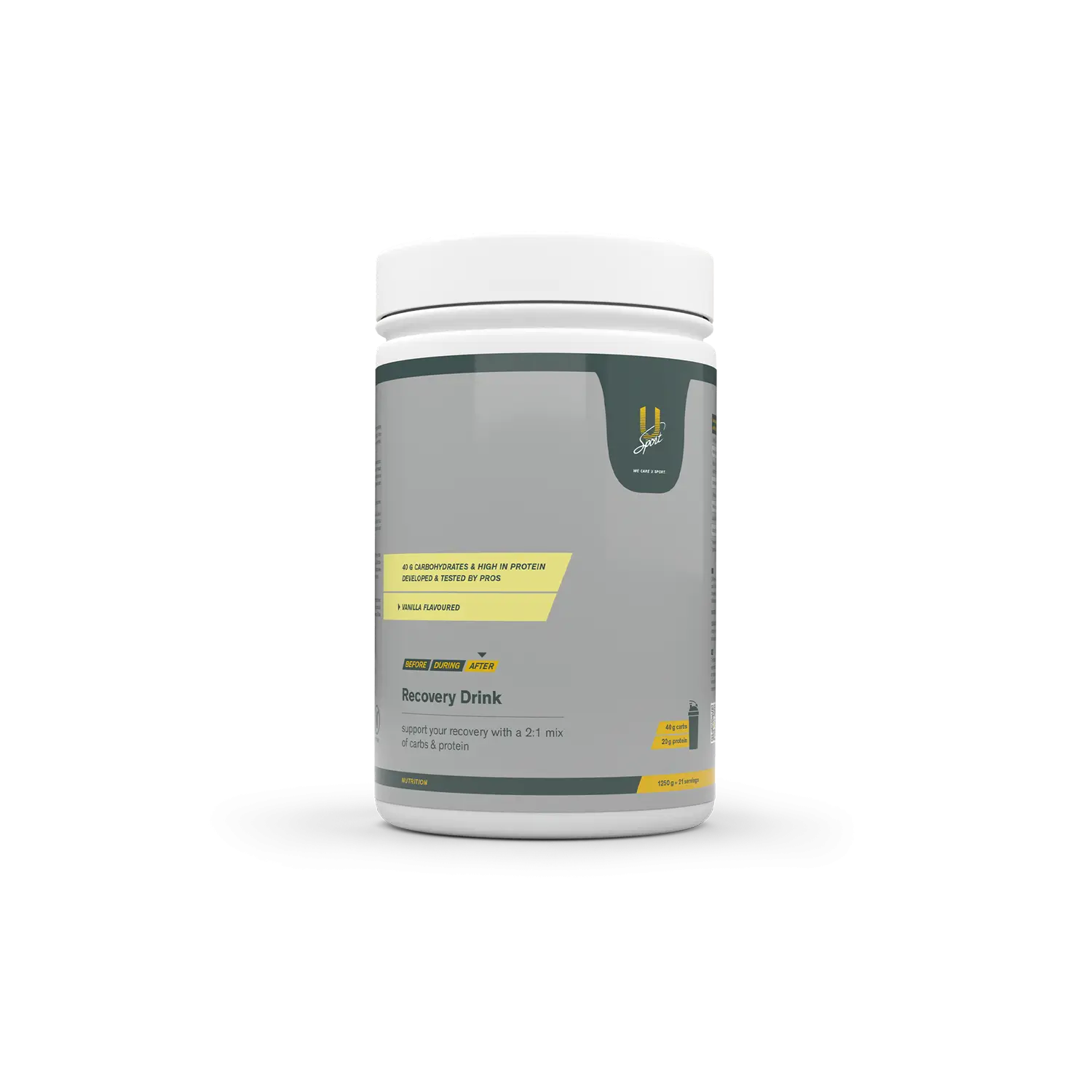 RECOVERY DRINK de U-SPORT (1250 g) est un complément de nutrition sportive destiné aux sportifs et aux adultes actifs. Recovery Drink contient un ratio équilibré de 2:1 entre glucides et protéines, avec 40 g de glucides et 20 g de protéines de whey par portion.